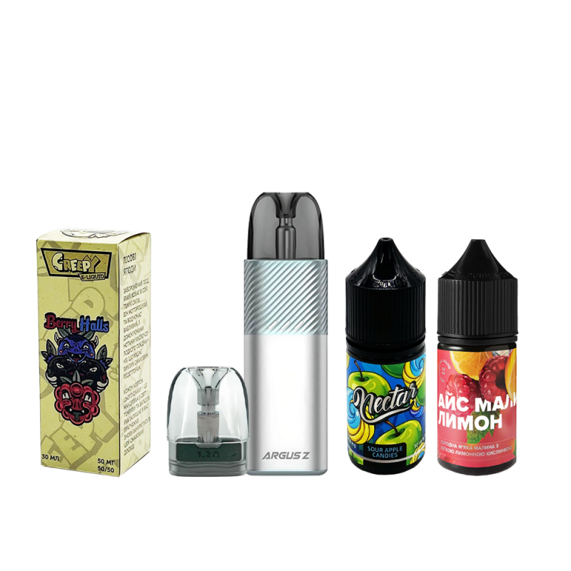 В комплект входять: Voopoo Argus Z 900 Mint Sliver (М'ятний, з картриджем) Многоразовий POD Картридж Voopoo Argus Pod 0.7 Ом TYPE-C кабель Картридж Voopoo Argus Pod 1.2 Ом 2 мл Рідина Creepy Berry halls (Ягідний Холс, 50 мг, 30 мл) Рідина Nectar Sour apple candies (Кислі яблучні цукерки, 50 мг, 30 мл) Рідина 420 Liquid Айс Малина Лимон (50 мг, 30 мл)