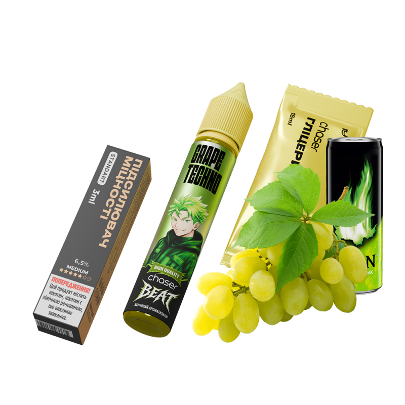 Набір для самозамішування Chaser Beat Grape Techno (Виноградний Енергетик, 65 мг, 30 мл) надає вейперам унікальні смакові відчуття. Ця жижа ідеально підходить для багаторазових вейпів завдяки своїй оптимальній густоті, безпечному складу та приємному аромату, відкриваючи нові грані смаку.