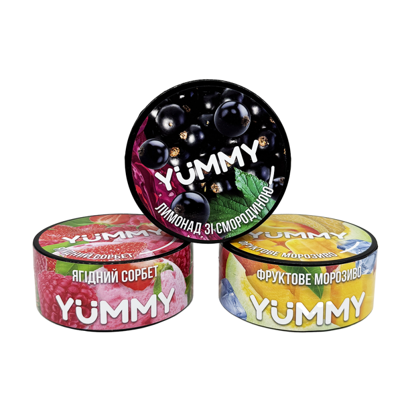 В набор входят: Табак Yummy Ягодный сорбет (100 г) Табак Yummy Фруктовое Мороженое (100 г) Табак Yummy Лимонад со смородиной (100 г)