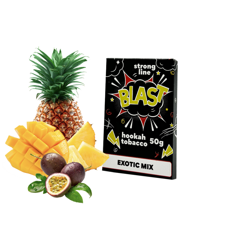 Найпопулярнішим серед поціновувачів димного відпочинку є Тютюн Blast Smoke Strong Line Exotic Mix (Екзотичний мікс, 50 г) від Blast Smoke. Основа кальянної заправки — це тютюновий лист Virginia, Burley високої якості, а також натуральні ароматизатори, патока та чистий гліцерин. Завдяки цьому тютюн має насичений смак Ананас, Манго, Маракуя, приємний аромат і здатний утворювати густий дим.