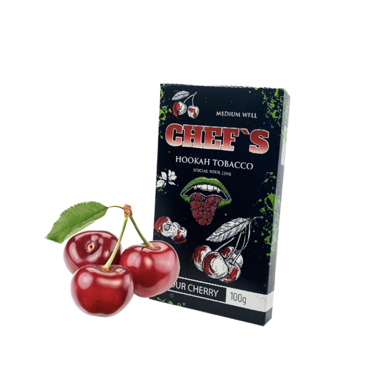 Найпопулярнішим серед поціновувачів димного відпочинку є Тютюн Chefs Sour Cherry (Кисла Вишня, 100 г) від Chefs. Основа кальянної заправки — це тютюновий лист Virginia, Burley високої якості, а також натуральні ароматизатори, патока та чистий гліцерин. Завдяки цьому тютюн має насичений смак Вишня Черешня, приємний аромат і здатний утворювати густий дим.