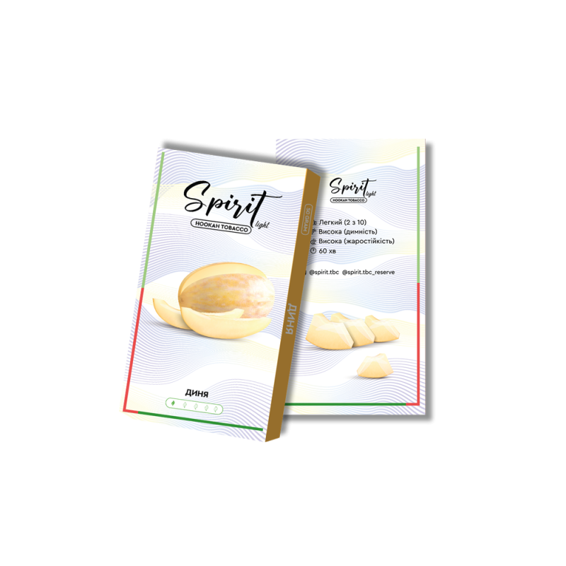 Найпопулярнішим серед поціновувачів димного відпочинку є Тютюн Spirit Light Диня (50 г) від Spirit. Основа кальянної заправки — це тютюновий лист Virginia високої якості, а також натуральні ароматизатори, патока та чистий гліцерин. Завдяки цьому тютюн має насичений смак Диня, приємний аромат і здатний утворювати густий дим.