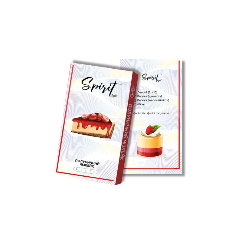 Найпопулярнішим серед поціновувачів димного відпочинку є Тютюн Spirit Light Полуничний Чізкейк (50 г) від Spirit. Основа кальянної заправки — це тютюновий лист Virginia високої якості, а також натуральні ароматизатори, патока та чистий гліцерин. Завдяки цьому тютюн має насичений смак Полуниця, Чізкейк, приємний аромат і здатний утворювати густий дим.